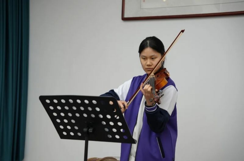 座談間隙,學生們的精彩表演讓現(xiàn)場溫情再升級:206班盧雨萱的古箏獨奏《春江花月夜》,弦音裊裊、古韻悠長;207班譚力的獨唱《心中的日月》,歌聲清澈、滿含敬意;208班劉彩雯的小提琴獨奏《月半小夜曲》,旋律流轉、祝福暗藏。孩子們專注的神情、真摯的情感,贏得老教師們陣陣掌聲。